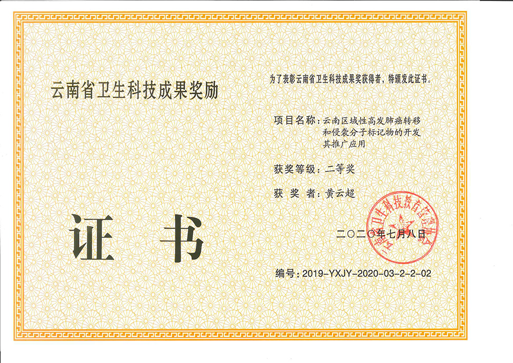 2020年云南省卫生科技成果二等奖 - 黄云超