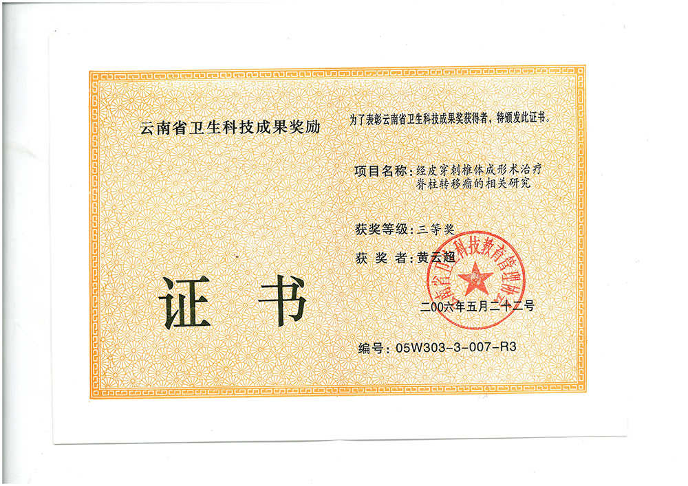 2006年云南省卫生科技成果奖励三等奖 - 黄云超