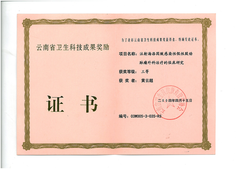 2004年云南省卫生科技成果奖励三等奖 - 黄云超