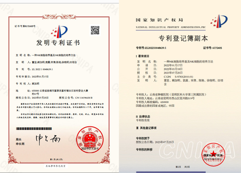 开展细胞治疗产品的质量控制体系研究,制备的脐带间充质干细胞获得中国食品药品检定研究院检验报告,是昆明医科大学范围内第一家获得国家干细胞质量认证的医疗机构。近三年申报专利4项,获发明专利1项(一种NK细胞培养基及NK细胞的培养方法,专利号:ZL202210048639.1),形成团体标准2项,参编团体标准2项,获软件著作权2项,参编《干细胞标准化研究蓝皮书》,为我省乃至国家开展细胞治疗的质控莫定了基础。