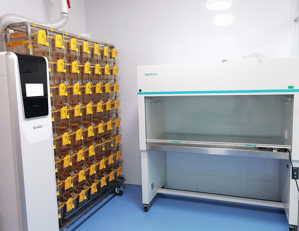 屏障环境饲养体量为110笼,可饲养各品系小鼠近500只,备有IVC饲养笼、通风柜、温度湿度监控系统等辅助饲养设备。