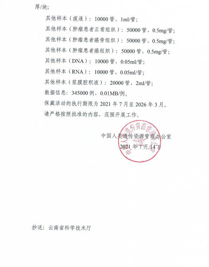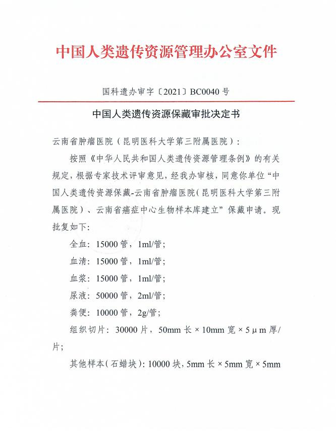 云南省肿瘤生物样本库依托肺癌重点实验室,专项建立肺癌生物样本库,为肺癌领域基础研究、临床转化及精准医疗提供针对性资源支撑。在规范化建设进程中,样本库于2021年1月顺利通过医院伦理委员会审查,确保样本收集、使用全流程符合伦理规范;同年7月,成功取得国家人类遗传资源保藏审批成为云南省第一家具有国家人类遗传资源保藏资质的专科医院。建立健全伦理审查、知情同意、样本使用等管理制度,确保样本收集、使用全过程合法合规,保护捐赠者隐私与权益,可合法合规提供多种生物样本的专业存储。