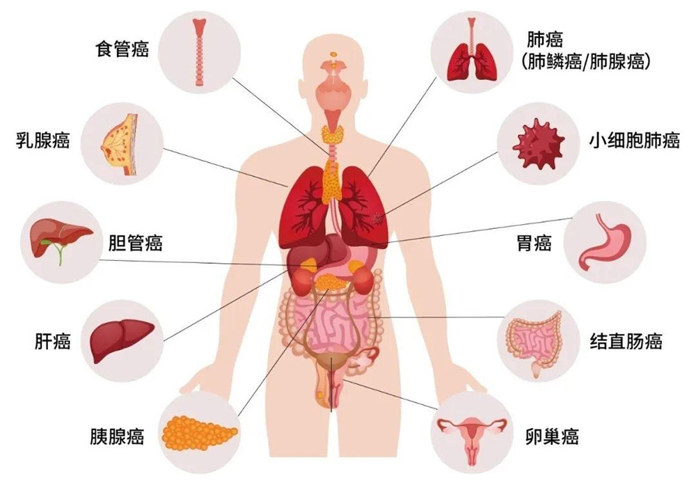 肺癌、乳腺癌、结直肠癌、肝癌、胰腺癌、胆囊癌、卵巢癌、宫颈癌、子宫内膜癌、食管癌、胃癌、喉癌、甲状腺癌、口腔癌、肾癌、前列腺癌、膀胱癌、输尿管癌、骨肉瘤、软组织肉瘤等。